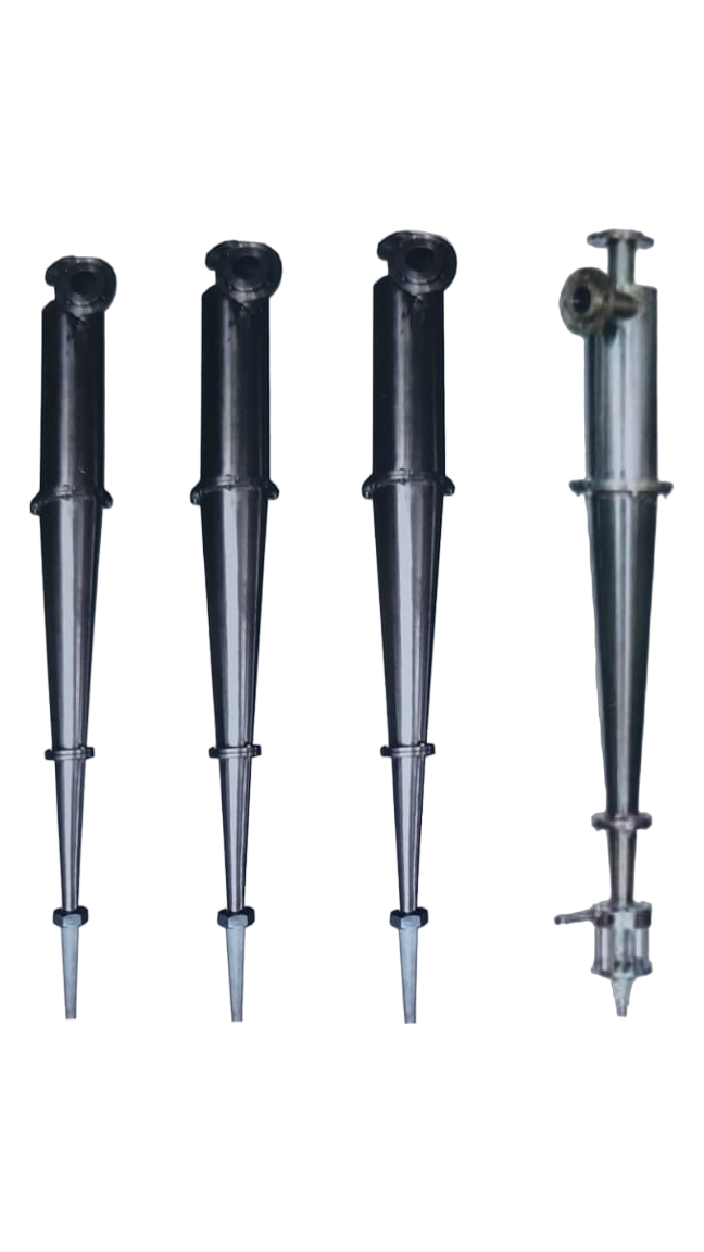 Make Low Density Cleaner or Centricleaner separates components from the liquid containin Particles by introducing feed with high velocity in inlet tangentially into cylindrical body which set up circular flow and creates a cyclone to remove Air, Dirt, Sand, Unbeaten Paper Chips and other Nor Fibrous Dense Particles from Pulp and light particles discharged from discharge Nylon Nozzle at bottom.